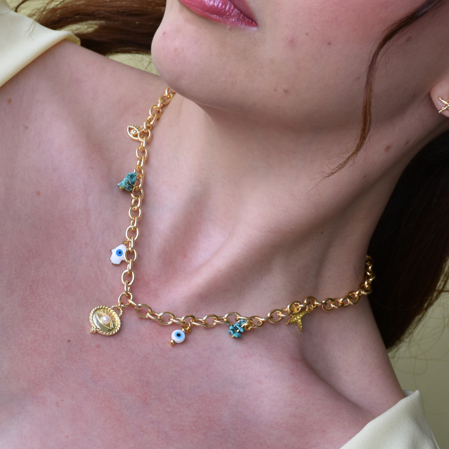 Collar con piezas y dijes en baño de oro de 24 k (INCLUYE TOPITOS)