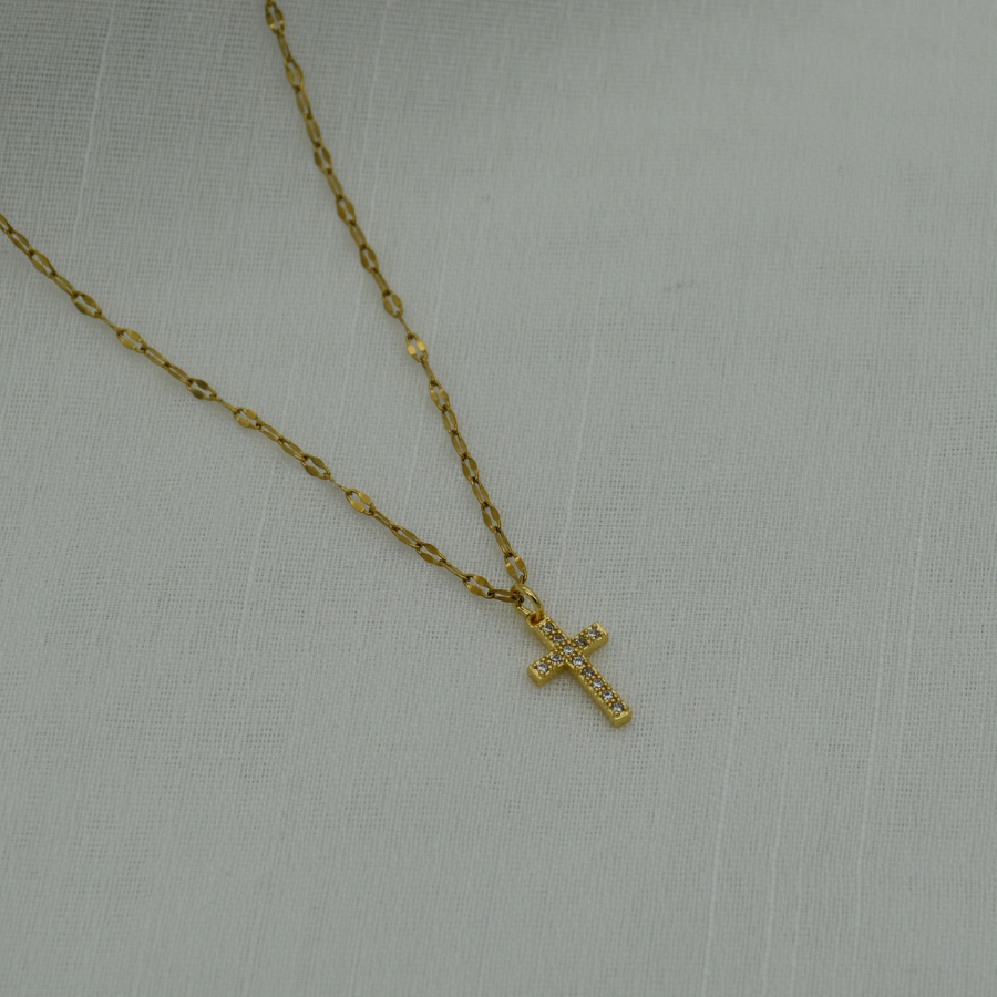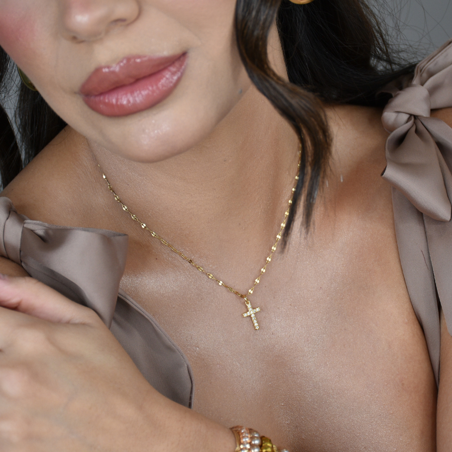 Cadena en acero de 42 cm con dije en baño de rodio con incrustaciones
