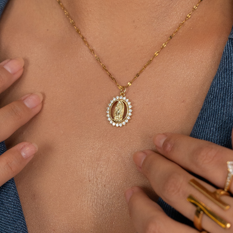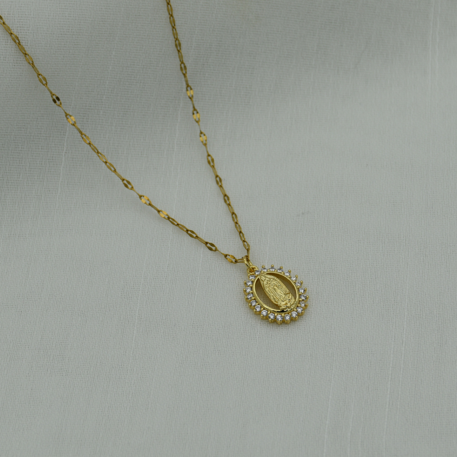Cadena en acero de 42 cm con dije en baño de rodio con incrustación