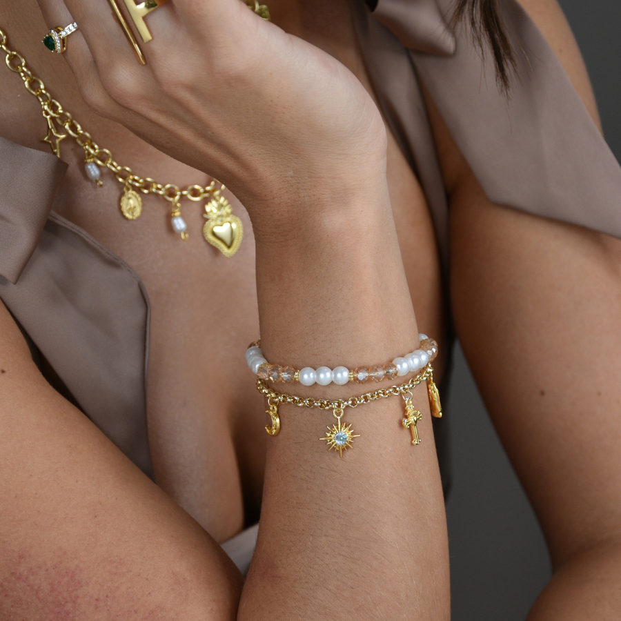Pulsera en perla de vidrio con piezas en baño de oro de 24 k, dije de virgen con incrustaciones