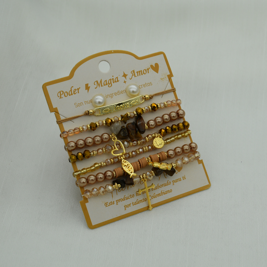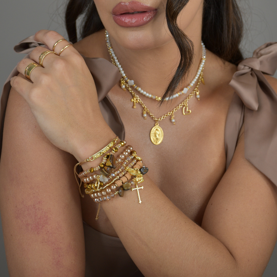 Set de pulseras en nylon elástico con piezas doradas en baño de oro de 24 k (INCLUYE TOPITOS SURTIDOS)